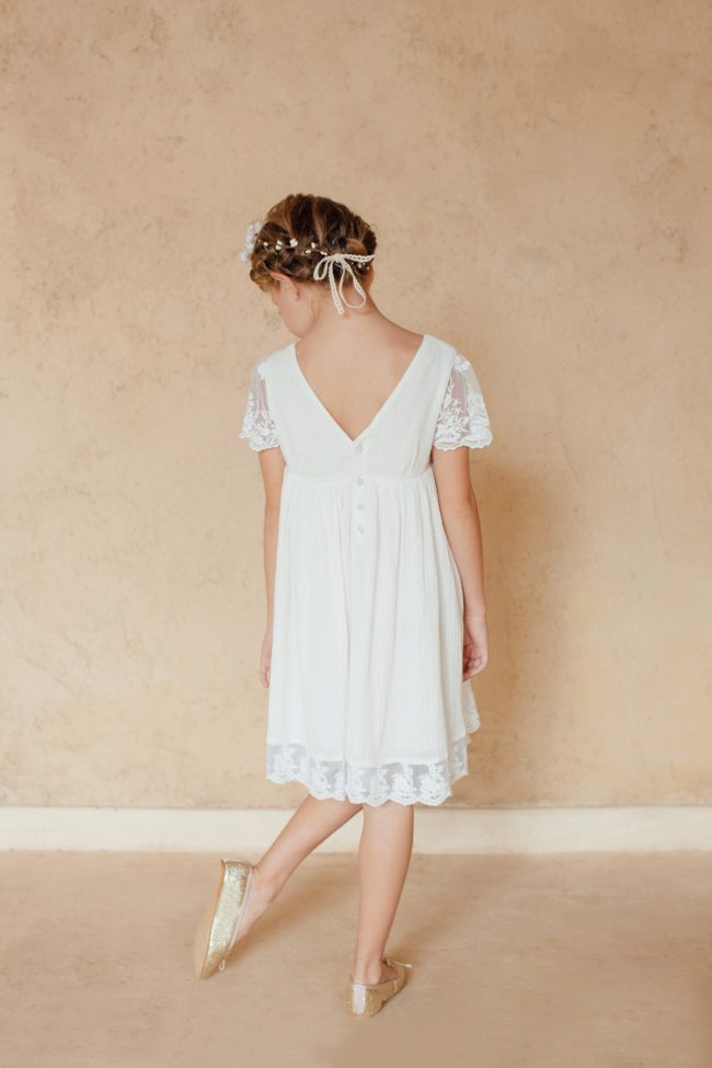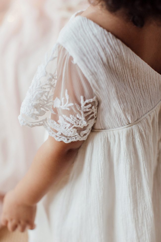 La robe Manon imaginé par Les Petits Inclassables adopte un style résolument bohème grâce à la texture plissée du crêpe de coton et ses détails en dentelle brodée aux manches et au bas de la robe.