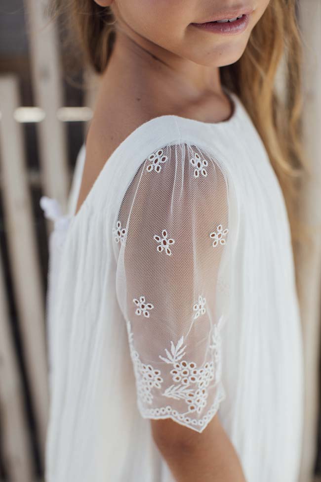 Nous avons immédiatement été séduites par la finesse et l’élégance de la robe Thelma des Petits Inclassables. Les manches et les volants en dentelle de coton lui confèrent un aspect vaporeux et délicat, pour un rendu des plus distingué. Ce côté poétique est accentué par les broderies en coton qui viennent apporter une touche de fantaisie à la robe.