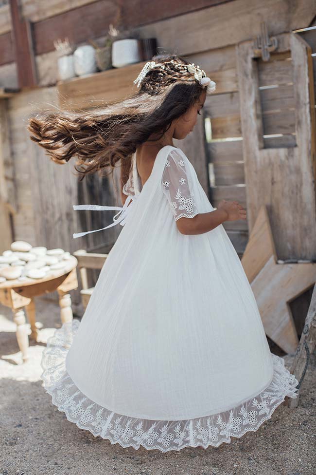 La robe Thelma trouvera sa place lors d’un mariage bohème, une cérémonie religieuse comme une communion ou une profession de foi ou tout simplement une fête sur le thème de la nature et de la simplicité.